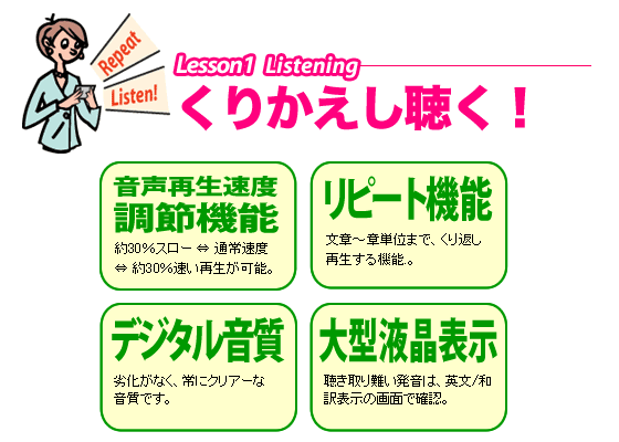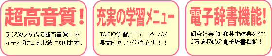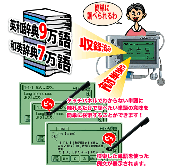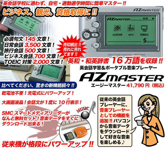AZマスター商品構成 ●本体 ●英会話ブック ●リモコン ●携帯用ケース ●イヤホン ●取扱説明書 ●充電池 ●スマートメディア(32MB) ●クレイドル ●カードリーダー ●充電器兼用アダプター ●SMCフォーマット用CD ●プレゼントCD2枚 ●数で鍛える脳力パズル